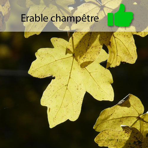 L’érable champêtre (acer campestre) a une feuille en forme de main (ça me rappelle un peu la feuille d’aubépine) avec 5 lobes tous arrondis au bout.