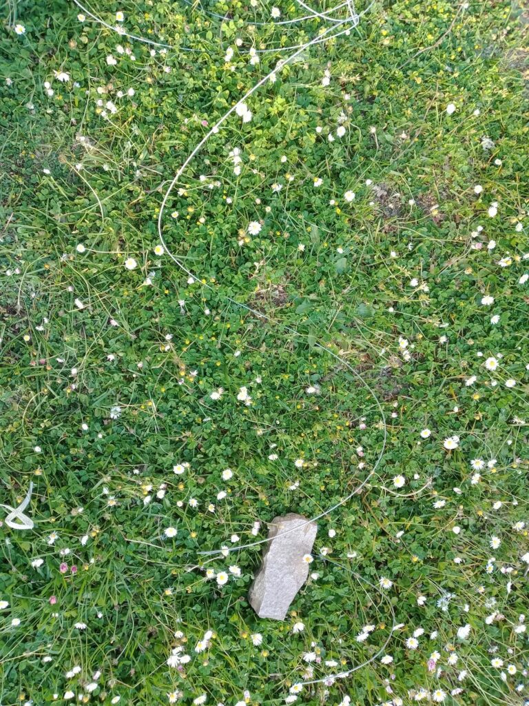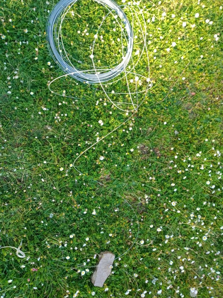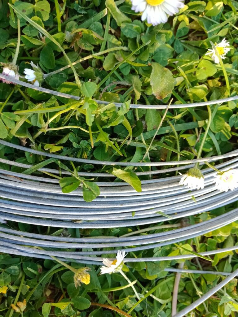 Pourquoi je le déconseille ? Car les chevaux ne le voient pas. Même s’il est bien conducteur pour une cloture électrique, le fil galva gris est trop fin et on arrive à peine à le distinguer. Les chevaux ne verront les limites de leur pré qu’une fois qu’ils auront pris une chataigne. C’est pas très sympa pour eux…